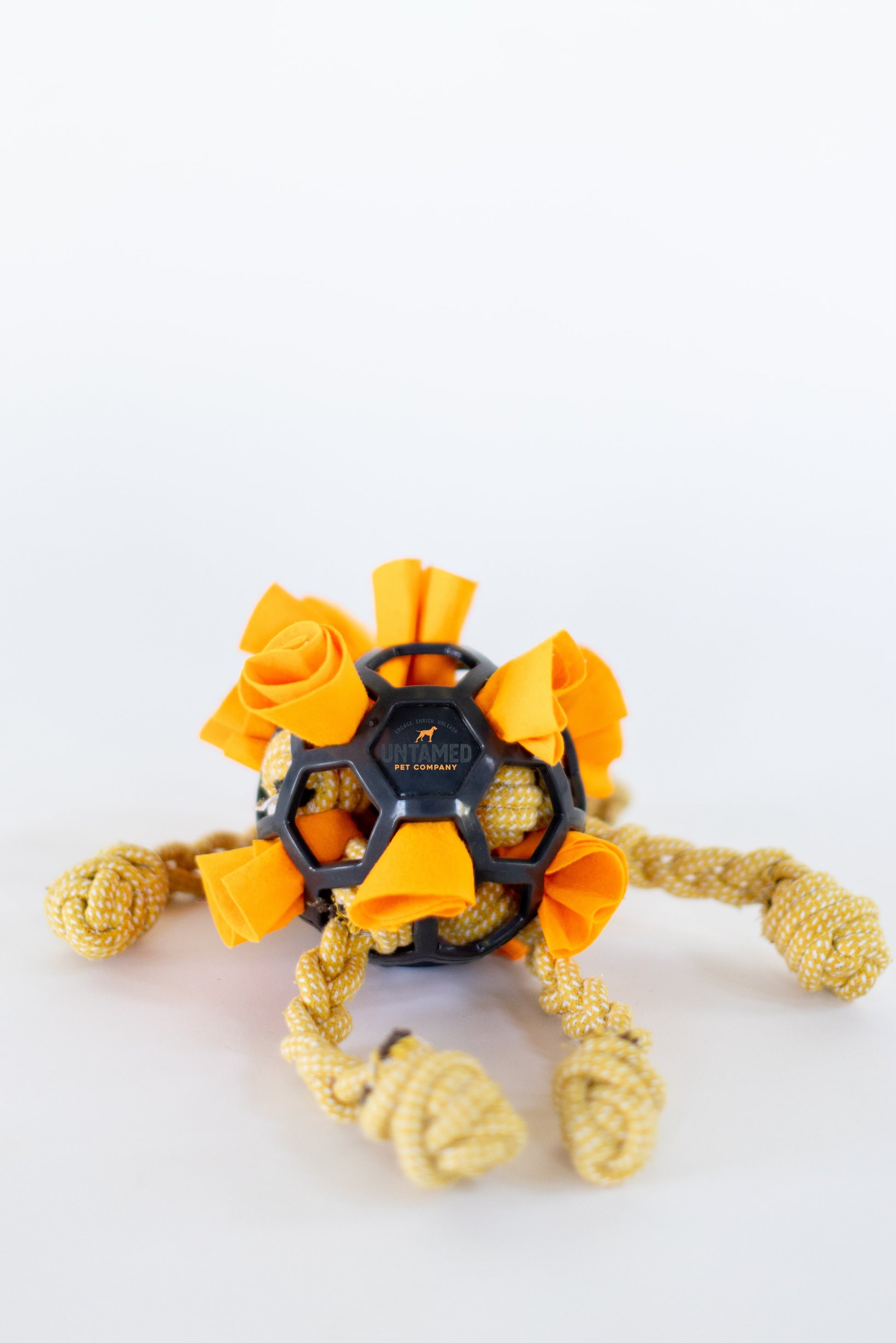 ● Customizable Challenge: Stuff treats or kibble into felt flaps, braid folds, and around rope sections. To vary the difficulty, rope can be inserted into different points on the ball.